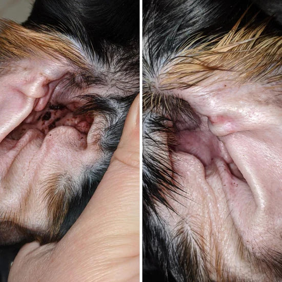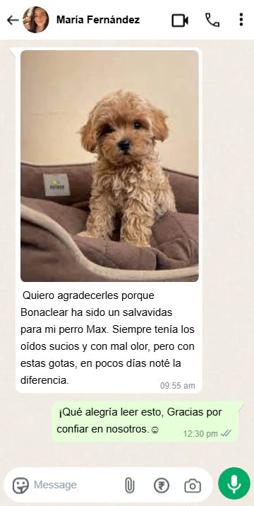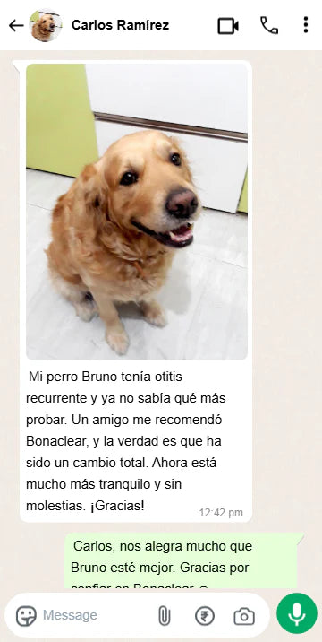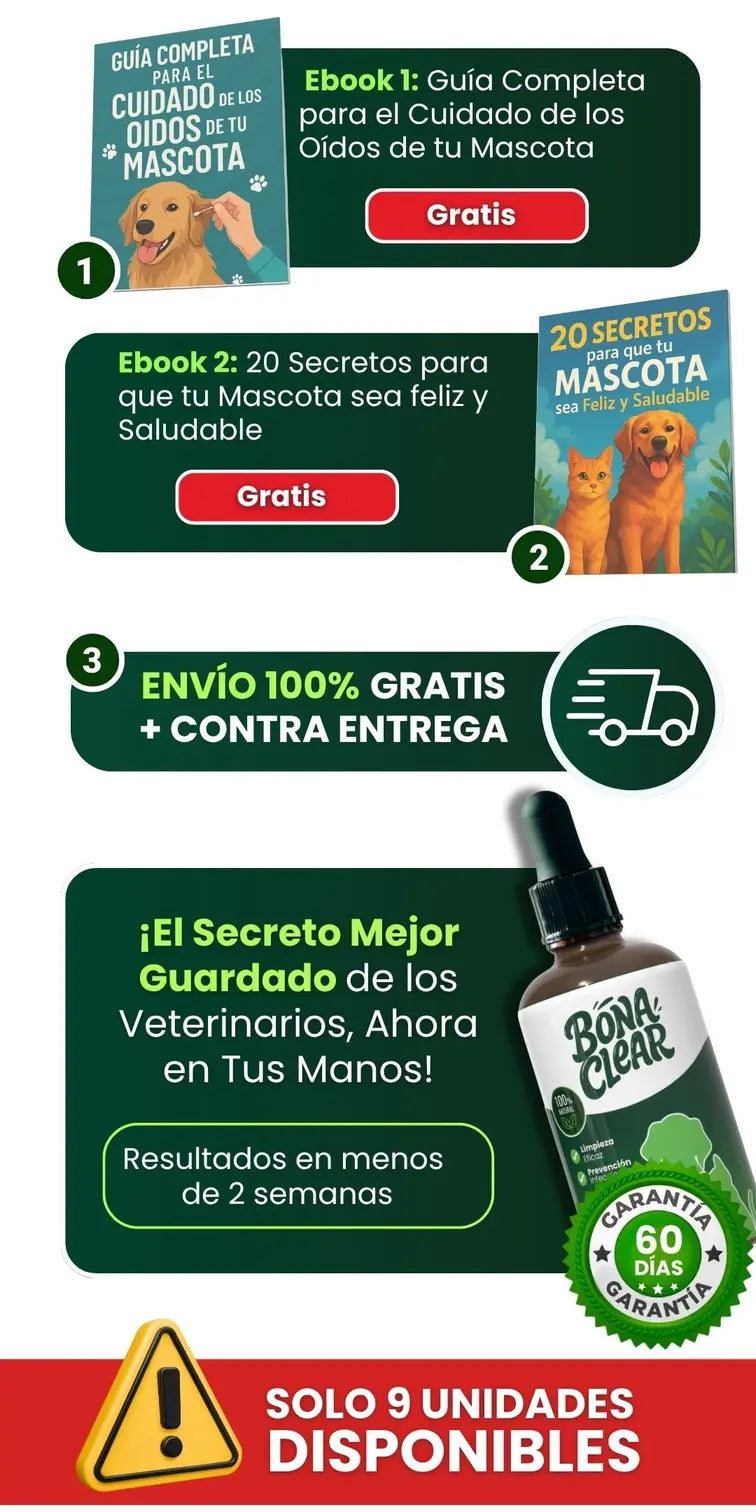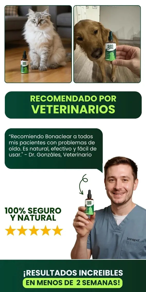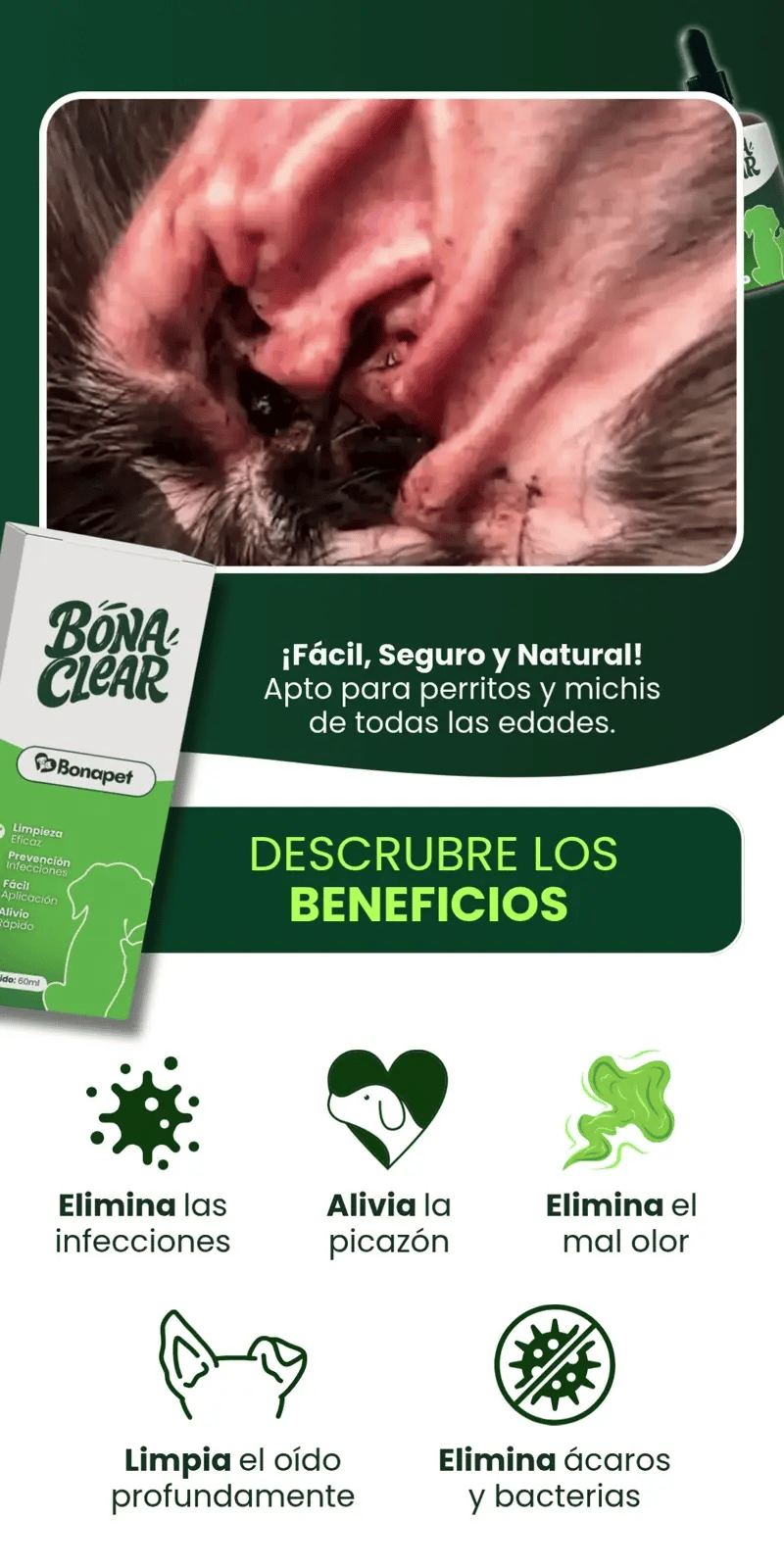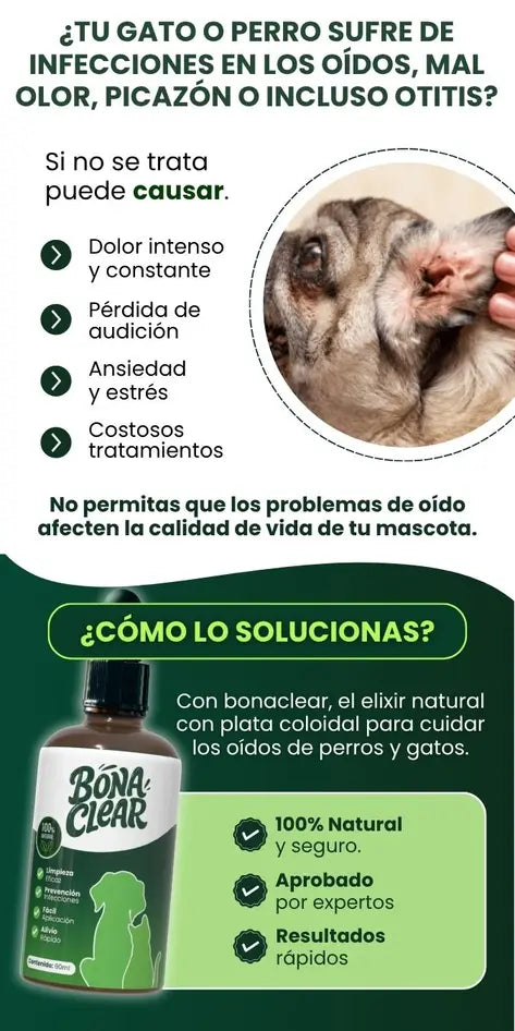 BONACLEAR está hecho con ingredientes naturales y su fórmula estrella incluye plata coloidal, un poderoso antimicrobiano que elimina bacterias, hongos y mal olor, mientras protege y calma los oídos de tu mascota.