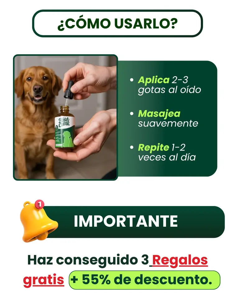 - Aplica el producto: Coloca unas gotas de BONACLEAR directamente en el canal auditivo de tu mascota. No necesitas introducir objetos ni hisopos.